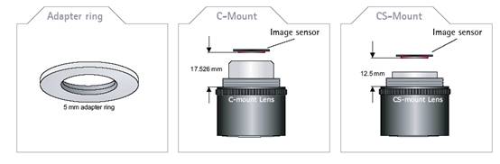 A: 镜头的安装方式有C型安装和CS型安装两种。C型镜头安装基准面到焦点的距离是17.536mm,大多数摄像机的镜头接口则做成CS型,因此将C镜头安装到CS接口的摄像机时需要配一个5mm厚的CS/C转接环,CS镜头则不可装到C型接口的摄像机。