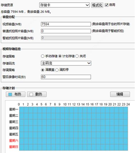 (2) 启用计划存储,设置存储计划,即需要设备录像的时间。