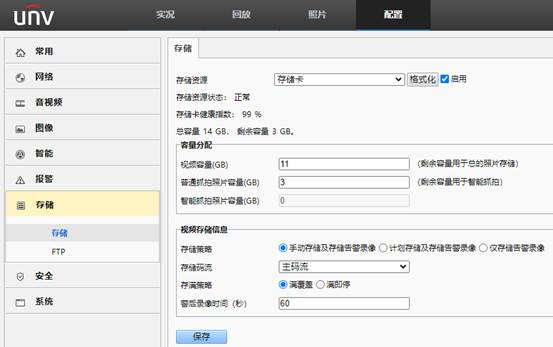 选择[配置>存储>存储],进入[存储]界面。选择“存储资源”为“存储卡”,并勾选<启用>,需要注意首次安装存储卡需格式化。根据实际需求完成容量分配、视频存储信息等配置。