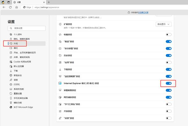 外观-Internet Explorer模式(IE模式)按钮 打开启用