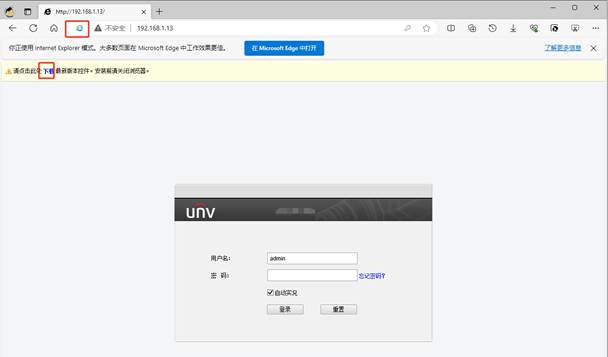 部分已停产的相机打开Edge浏览器下载安装控件后仍提示下载按钮,无法登陆,相机不支持Edge浏览器,只支持用IE登陆,可以通过Edge的IE模式登陆相机。