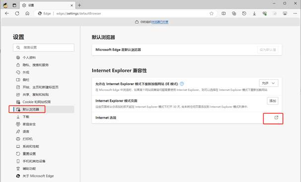 打开Edge设置-默认浏览器-Internet选项