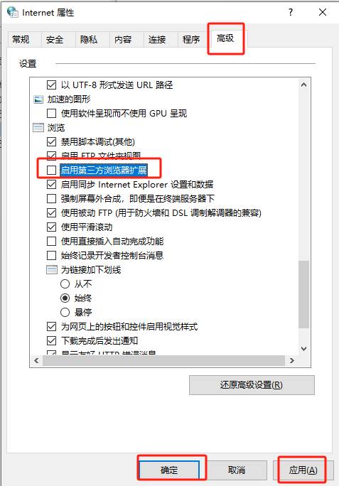 取消启用第三方浏览器扩展前的勾,重新打开IE即不会跳转