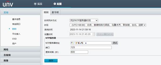 如果要同步NTP服务器时间,时间同步方式需选择同步NTP服务器时间,且需在IPC侧设置NTP服务器地址、端口及更新间隔;