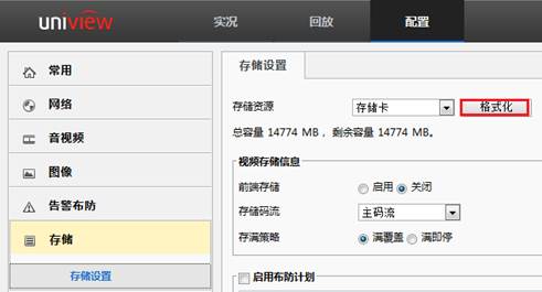 打开浏览器,输入摄相机的IP地址访问网页,点击【配置->存储->SD卡】查看总容量和剩余容量显示是否正常(首次接入SD卡需格式化)。
