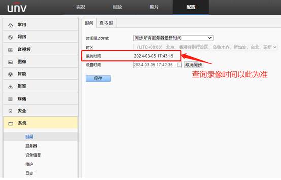 进入【配置->系统->时间】,查询录像时间以“系统时间”为准。