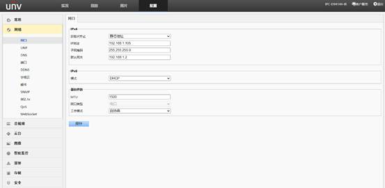 网口配置:修改设备的IP地址等通信参数,以便能与外部其他设备正常通信。网口配置有IPV4、IPV6两种协议,IPV4支持DHCP、PPPoE、静态地址三种模式;IPV6支持DHCP、手动两种模式。