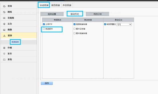 进入【报警】-【运动检测】-【规则设置】界面,配置检测框、灵敏度等信息,然后进入【联动方式】界面,勾选发送邮件。