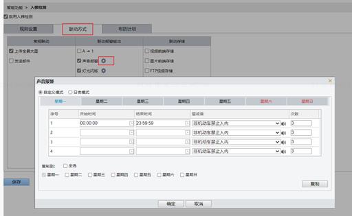 l 声音告警配置。点击声音报警配置,按需配置开始结束时间、警戒音、警戒次数,点击确定完成保存。