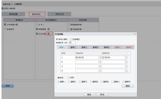 5、 根据需求配置联动方式,联动方式中声音报警和灯光闪烁默认开启。