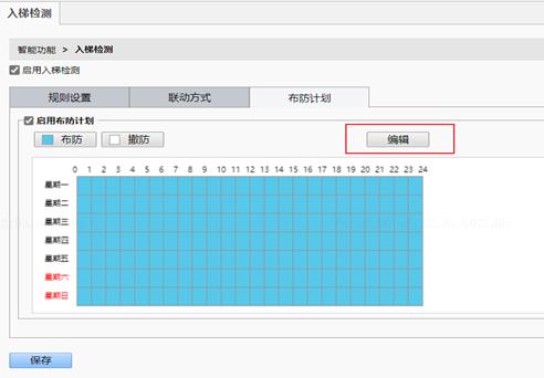 6、 联动方式配置完成后,配置布防计划。首先开启布防计划,点击编辑按需配置布防计划。