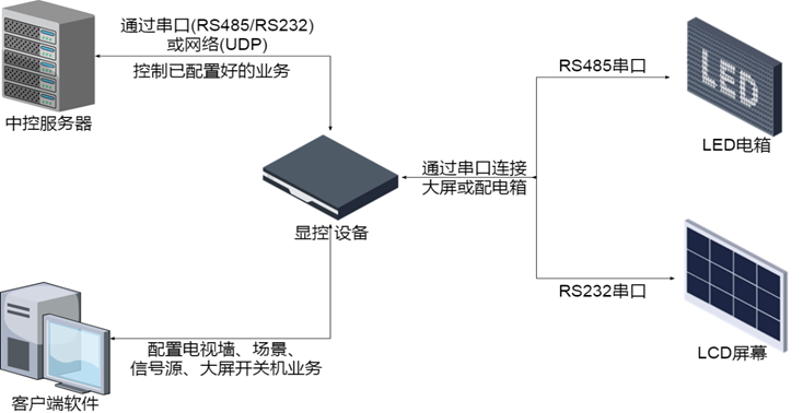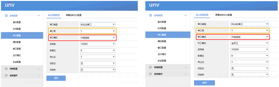 2) 点击“系统配置”—“串口配置”,根据串口接线方式选择“RS232串口”或“RS485串口”,并修改“串口模式”为“中控控制”,其它位置填写见下图。