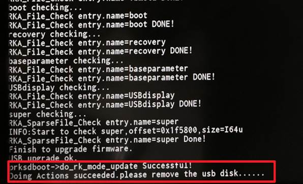 4)上图进度条完成后,设备进入下图升级界面。升级完成后,代码最后会出现红圈中移除U盘的提示,此时取下U盘设备会自动重启;