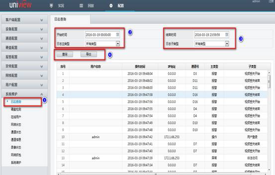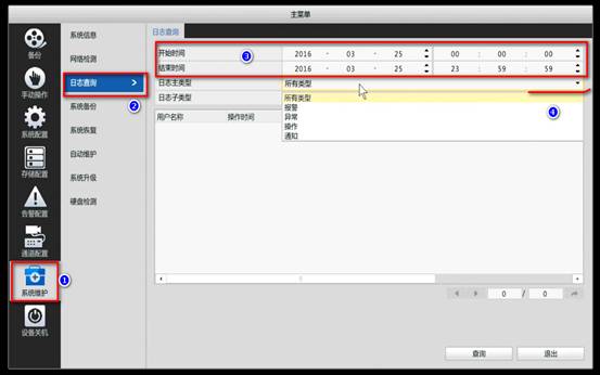 日志查询中可以根据主类型和子类型去查询相应日志,该日志中记录NVR上几乎所有的操作。