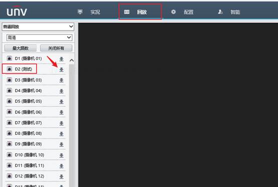 (1)点击【回放】按钮,在左侧通道列表选择对应摄像机,点击后面下载按钮。