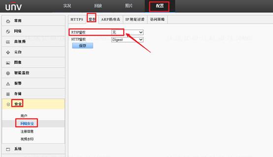 通过局域网访问摄像机,点击【配置】-【安全】-【网络安全】-【鉴权】-RTSP鉴权选择为无。