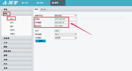 阿宇摄像机地址修改方法:通过局域网访问摄像机,点击【配置】-【网络】-【网口】-获取IP方式修改为静态,IP地址可设置为和录像机地址同一网段,子网掩码和网关设置一致。
