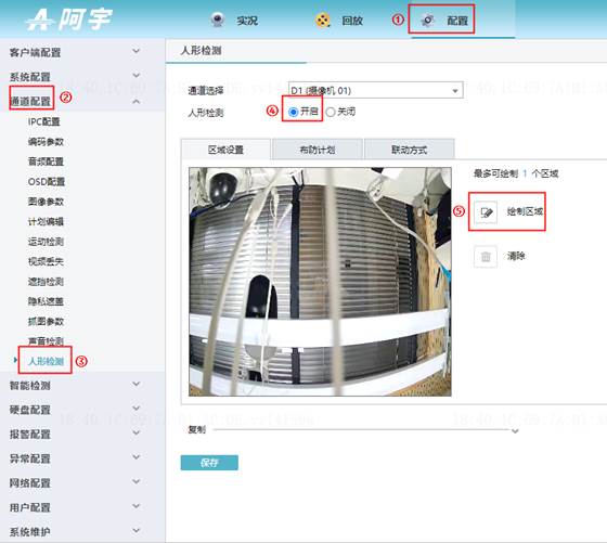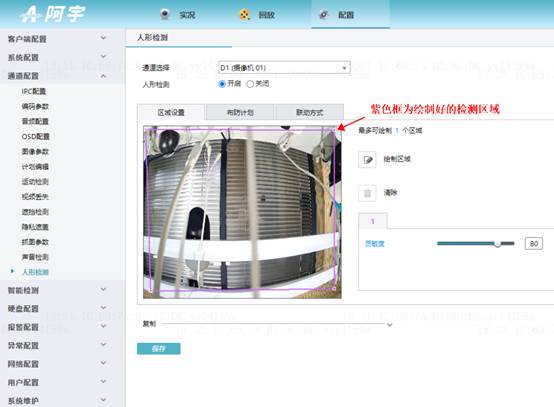 2.2【配置】-【通道配置】-【人形检测】-【开启】,绘制检测区域: