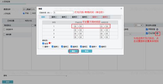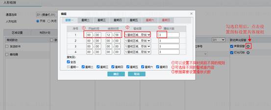 2.4联动方式里勾选声音报警和灯光报警,可点击设置图标,设置具体的时间段和播放/闪烁次数: