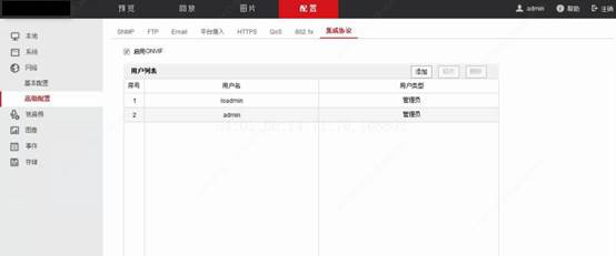 ①在配置>网络>高级配置>集成协议中,将“启用ONVIF”勾选上,然后在下方用户列表中新建一个admin的管理员用户