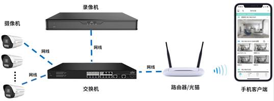 (1) 摄像机、录像机网线连接到交换机,交换机网线连接到路由器或者光猫,确保现场外网正常。