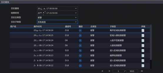 首先,选择[主菜单>系统维护>日志查询],进入[日志查询]界面,选择日志主类型为报警,查看录像机发出“滴滴”声时的报警事件。