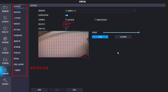 如果日志中的报警事件是运动检测、遮挡检测、视频丢失等(如下图框选出的报警事件类别所示),则选择[主菜单>报警配置],检查报警配置中是否联动蜂鸣器。以运动检测为例,单击联动方式后的