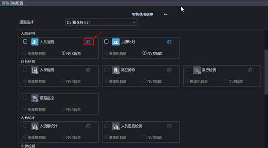 如果日志中的报警事件是人员检测、区域入侵等智能分析功能(如下图中的智能分析类别所示),则选择[主菜单>智能分析],检查智能分析功能是否联动蜂鸣器。以人员检测为例,单击人员检测功能的