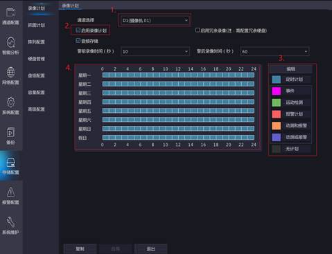 1、确认录像计划是否配置异常,右键主菜单->存储配置->录像计划(录像机网页界面:通道配置—>计划编辑),核实对应通道的录像计划是否启用、录像类型、时间计划是否正常。