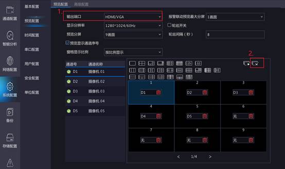 第二步:一般NVR是有多个输出端口的,而NVR的解码能力指的是所有口总共的解码能力,如果您同时接了多个显示器,那所有显示器解码实况的总和一定不能超过NVR的解码能力;如果您只接了一个显示器,需要关掉其他口的视频解码,具体操作如下:【主菜单--系统配置--预览配置】,选择未接显示器的输出端口,点击标记2图标关闭全部预览。