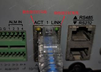 (2)录像机、交换机、路由器网络指示灯是否亮,每款设备情况不同,可类比周边正常设备的指示灯状态,下面以普通录像机指示灯举例,LINK绿灯常亮,ACT橙色灯闪烁代表正常,若异常,请排查网口和网线是否正常。