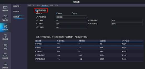 (3)常规情况下“端口映射”功能关闭,现场如需开启“端口映射”可根据实际需求配置,路径:【主菜单】-【网络配置】-【高级配置】-【端口映射】。