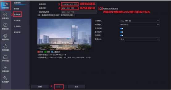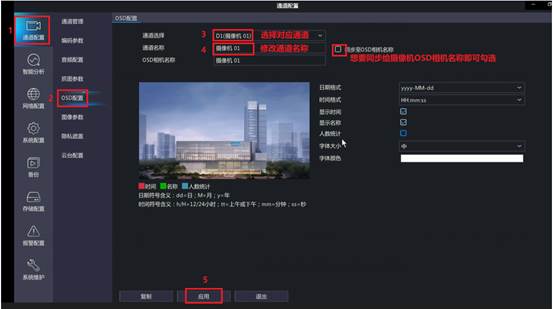 鼠标右键【主菜单—>通道配置—>OSD配置】界面,选择对应通道,修改通道名称,点击“应用”保存配置。
