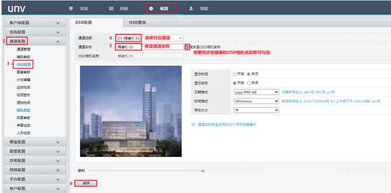 点击【配置—>通道配置—>OSD配置】,选择对应通道,修改通道名称,点击“保存”。