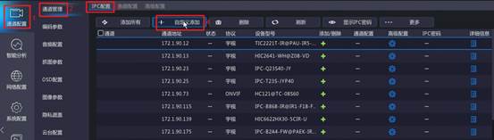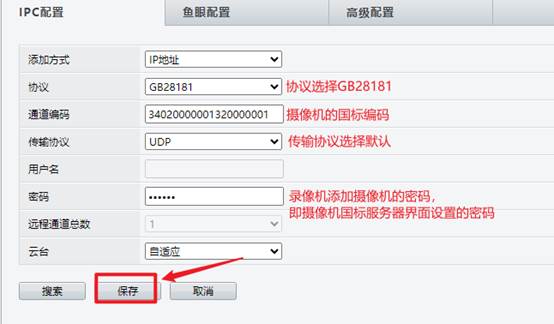 单机“配置—>通道配置—>通道管理—>IPC配置”,点击“添加”,输入摄像机国标编码和密码,协议选择GB28181,点击“保存”。