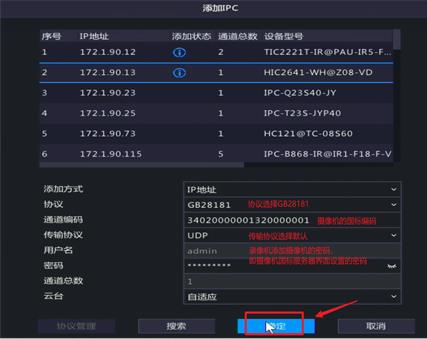 单机“配置—>通道配置—>通道管理—>IPC配置” ,点击“自定义添加”,正确输入摄像机国标编码和密码,协议选择GB28181,点击“确定”。