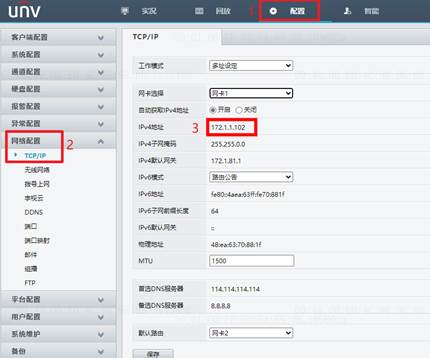 设置摄像机、录像机IP地址,确保摄像机和录像机之间网络互通,建议录像机和摄像机地址保持同一网段,若不在同一网段网络互通即可,录像机地址查看路径如下。