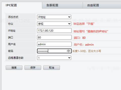 单机“配置—>通道配置—>通道管理—>IPC配置”,点击“添加”,正确填写摄像机IP地址、端口、用户名和密码,协议选择宇视协议,点击“保存”。