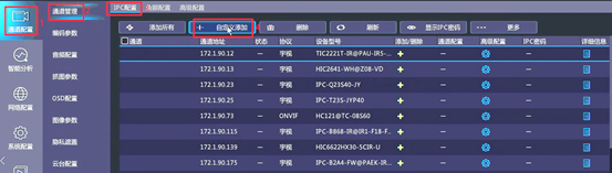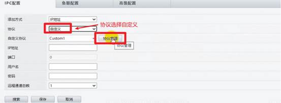 单机“配置—>通道配置—>通道管理—>IPC配置”点击“添加”,进入添加IPC界面,协议选择“自定义”,点击“协议管理”。