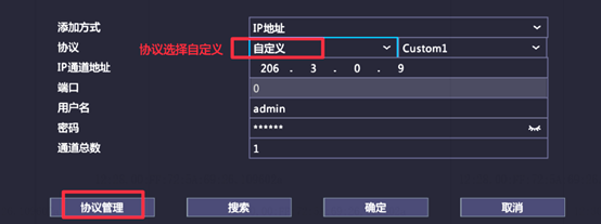 单机“主菜单—>通道配置—>通道管理—>IPC配置”,点击“自定义添加”,协议选择“自定义”,点击“协议管理”。