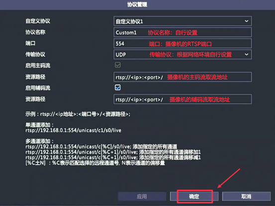 设置协议名称、摄像机的RTSP端口、传输协议及资源路径,点击确定,完成自定义协议配置。