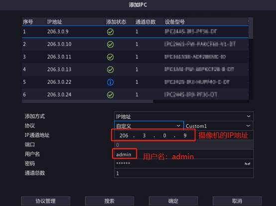 返回添加IPC界面,正确填写摄像机的IP地址、用户名和密码,点击确定。