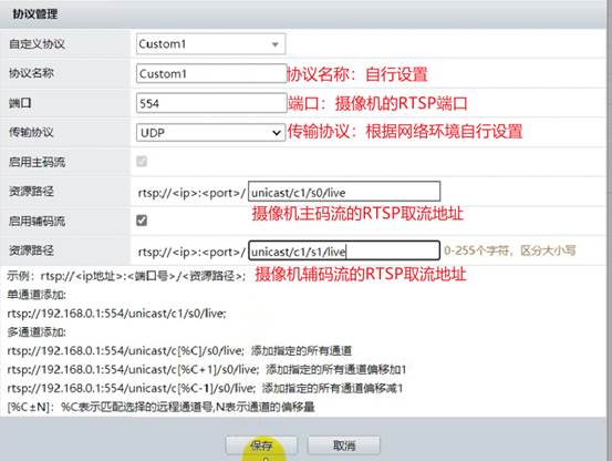 设置协议名称、摄像机的RTSP端口、传输协议及资源路径,点击保存,完成自定义协议配置。