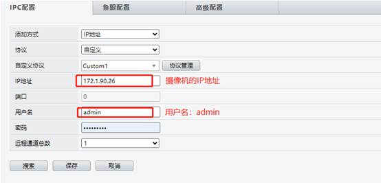 返回添加IPC界面,正确填写摄像机的IP地址、用户名和密码,点击保存,在IPC配置界面查看连接状态。