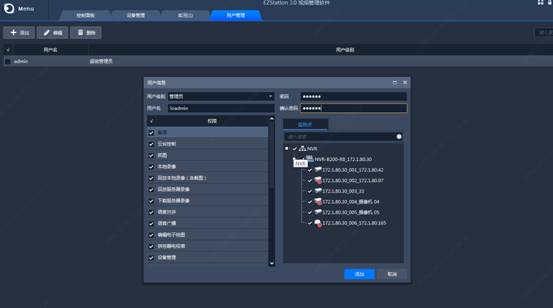 账号登陆权限可以根据左侧显示的内容进行设置,右侧是相机的勾选,配置完成后点击确认。