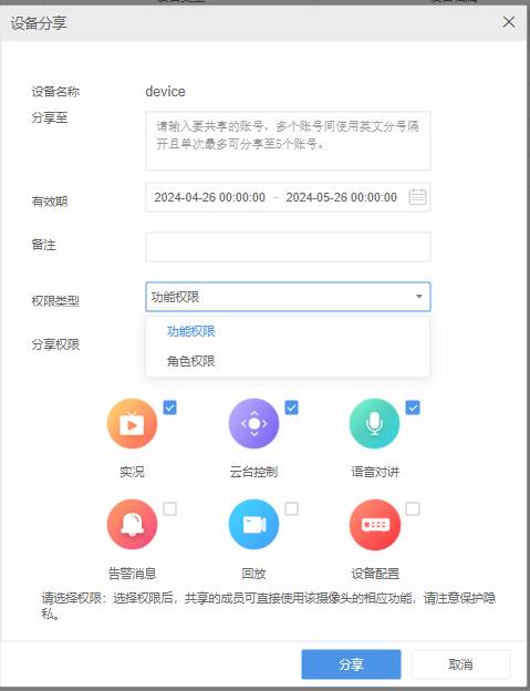 • 角色权限:选择设备的角色权限,被分享者拥有角色权限中设置好的权限。角色权限需提前在设备侧配置。