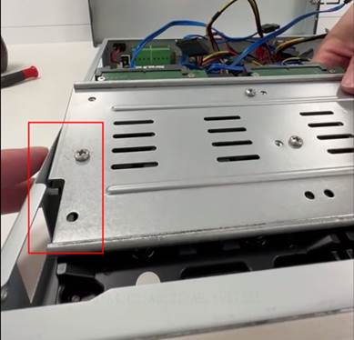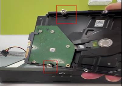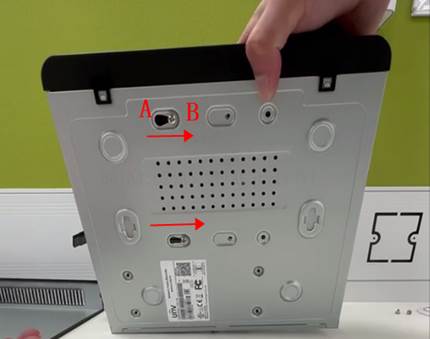 3、将硬盘放入NVR中,将刚才松拧的螺钉由A划到B