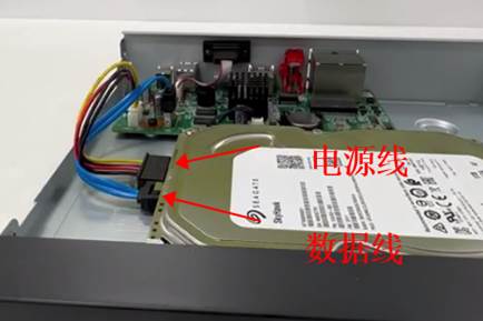 4、将挂架重新放回机箱内,并按照如图所示位置连接硬盘电源线、数据线。重复相同操作,连接上层硬盘。