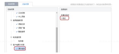 新建组织的根组织(如园区)出现在添加或修改角色对话框的[设备权限]页签下(见下图)。通过将角色与该组织绑定,使拥有该角色的用户可以在软件客户端上访问该组织下的资源(如园区下的音视频通道)。