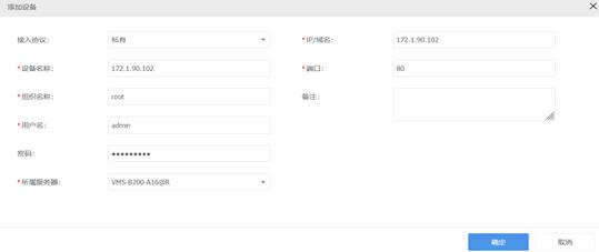 在基础配置—设备管理—普通编码配置中,点击添加,添加协议选择私有, 填写设备名称、选择对应组织、填写相机IP地址、端口号80、输入相机用户名和密码即可添加。